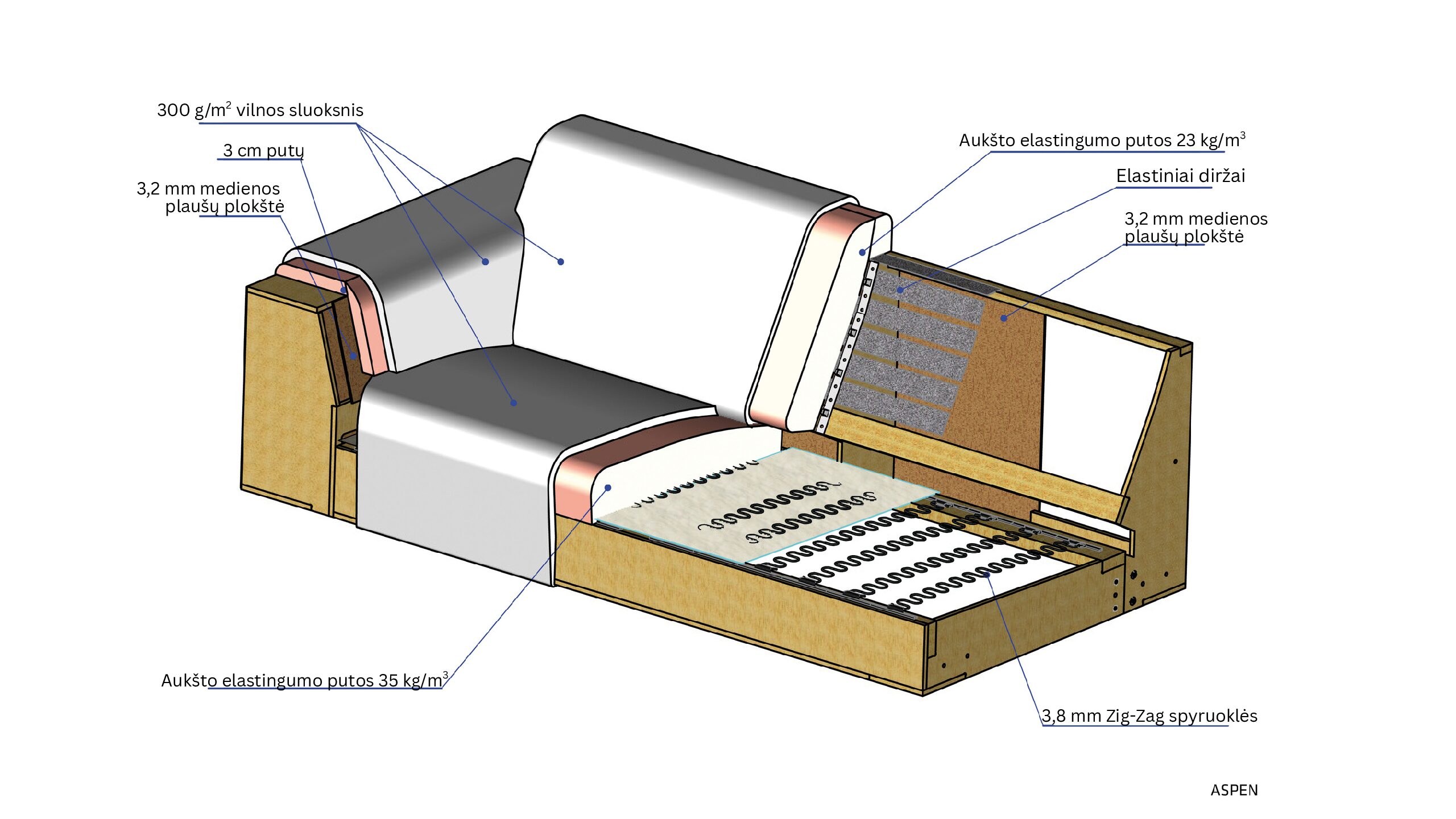 Rėmo gamyboje aukštos kokybės mediena, elastiniai diržai ir „Zig-Zag” spyruoklių sistema.