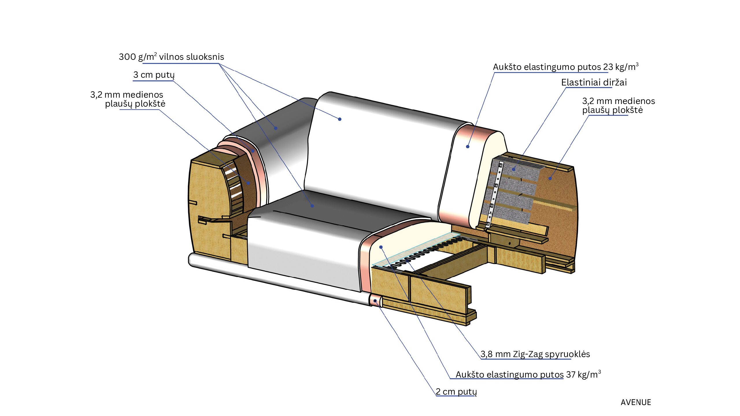 Rėmo gamyboje naudojama aukštos kokybės mediena, elastiniai diržai ir „Zig-Zag” spyruoklių sistema.