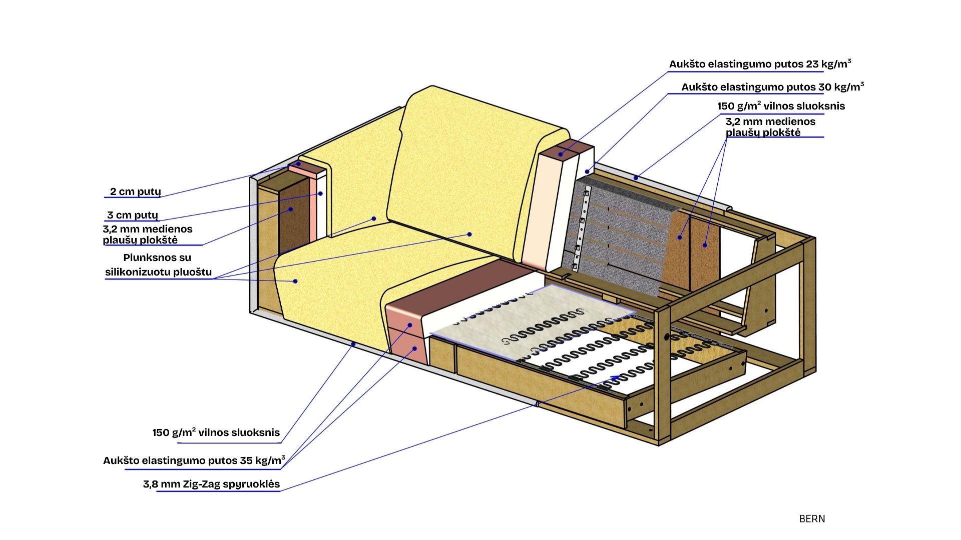 Rėmo gamyboje naudojama medžio masyvas ir klijuota mediena , „Zig-Zag” spyruoklių sistema, natūralios vilnos sluoksnis.