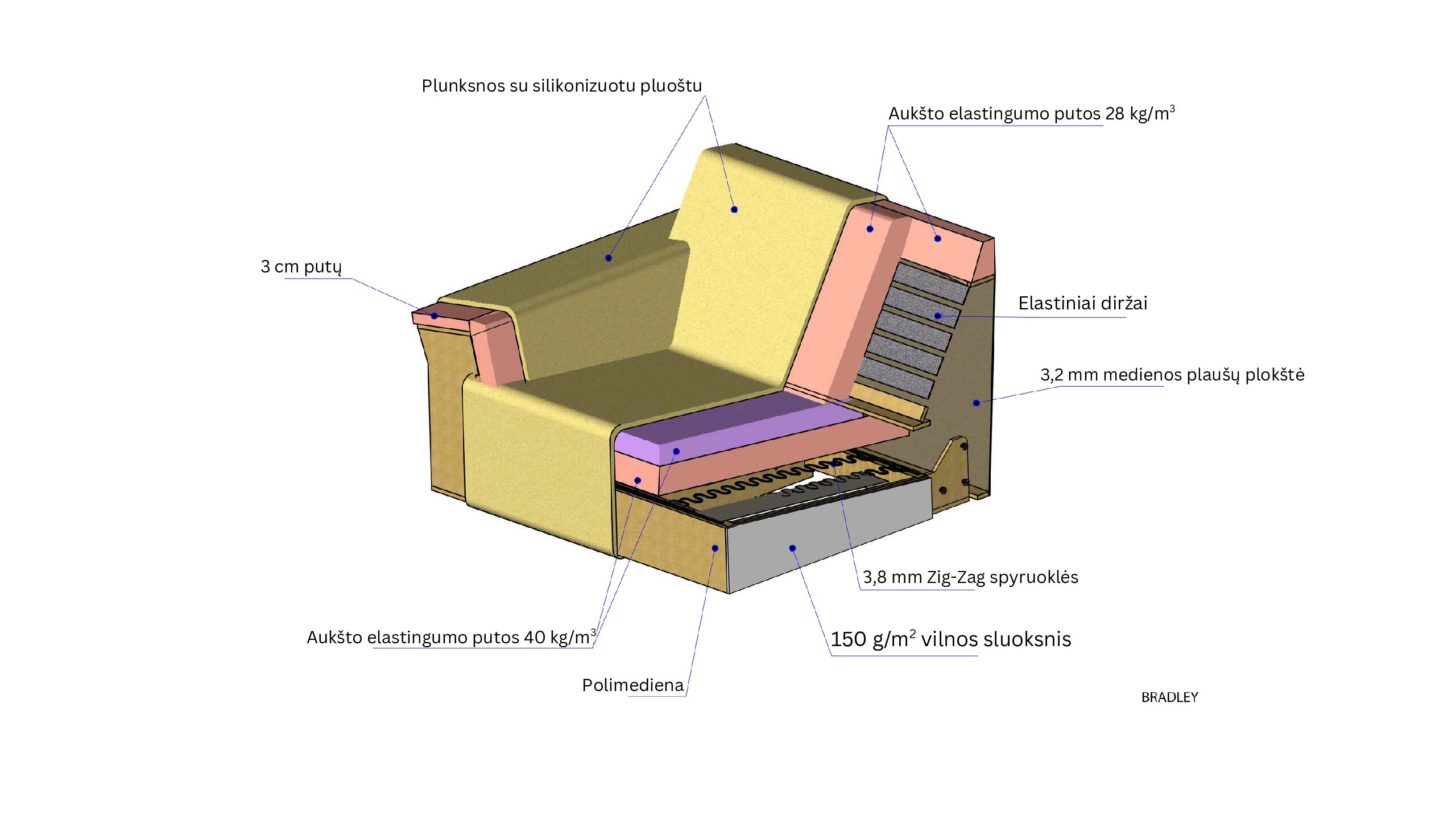 Rėmo gamyboje naudojama mediena , „Zig-Zag” spyruoklės, elastiniai diržai, 150 g. vilnos sluoksnis.