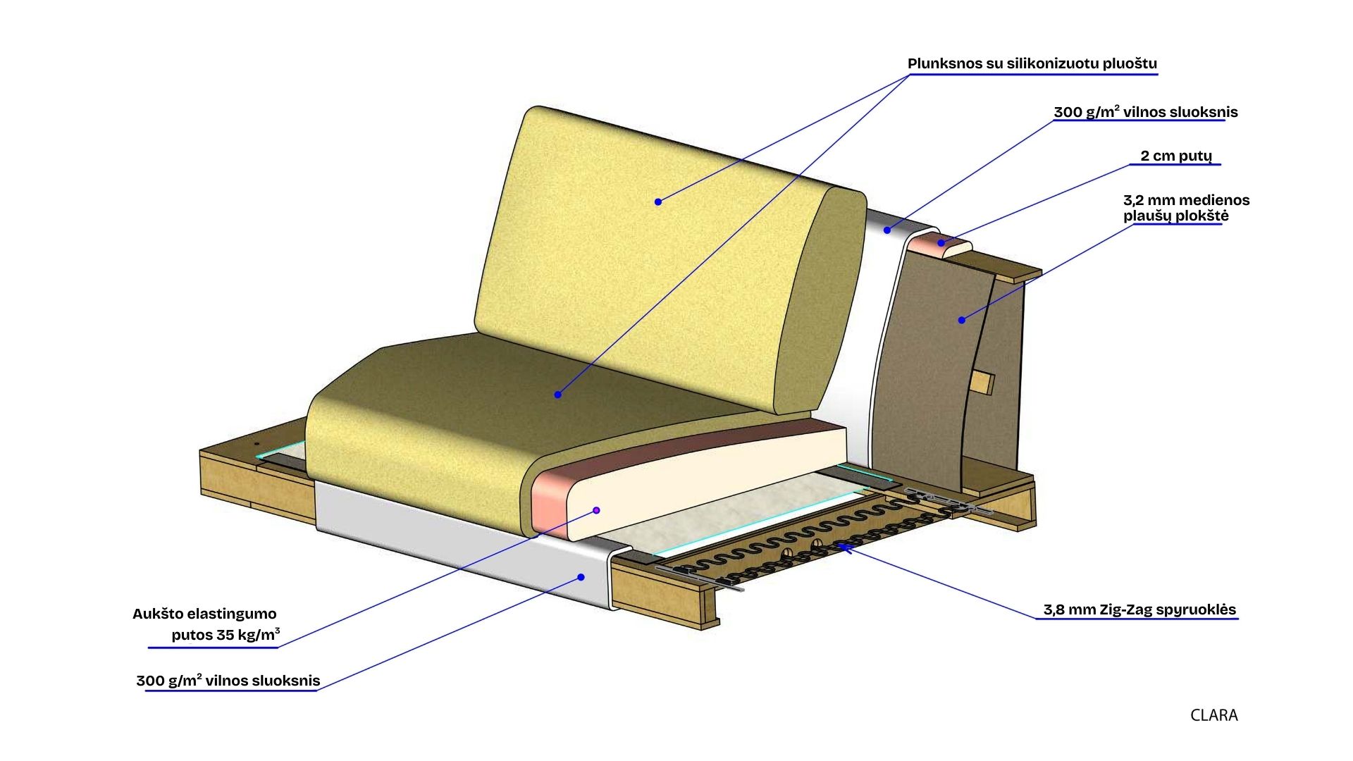 Rėmo gamyboje naudojama mediena ir „Zig-Zag” spyruoklės.