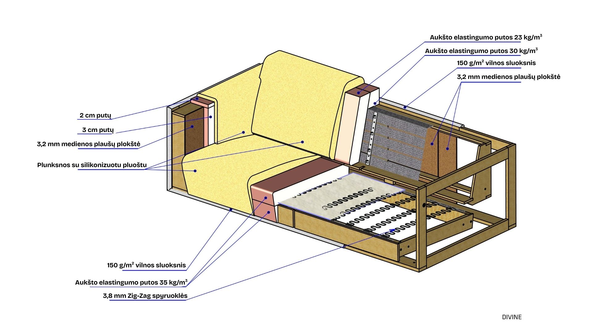 Rėmo gamyboje naudojama mediena , „Zig-Zag” spyruoklės, elastiniai diržai, 150 g. vilnos sluoksnis.