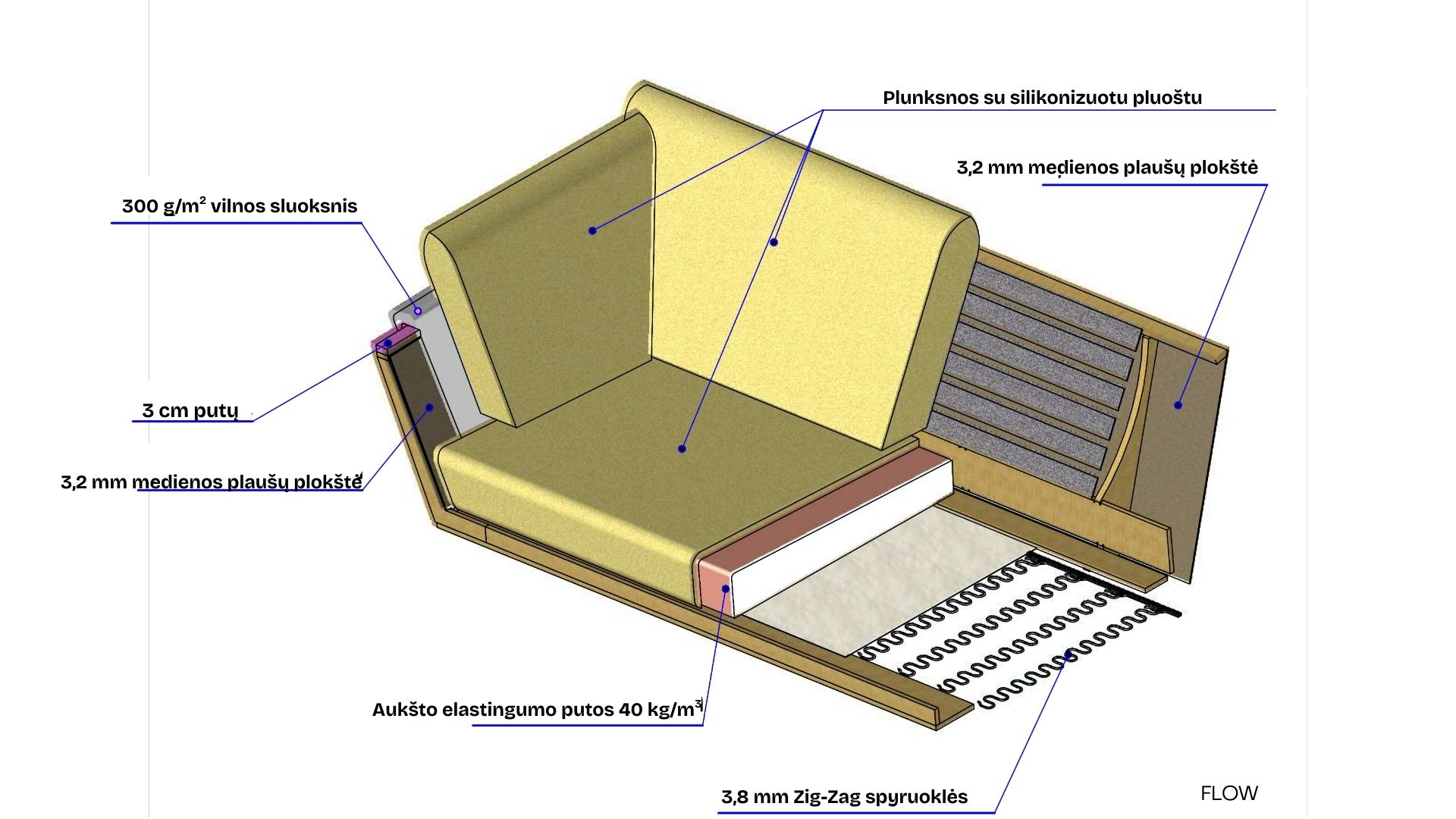 Rėmo gamyboje naudojama mediena ir „Zig-Zag” spyruoklės.