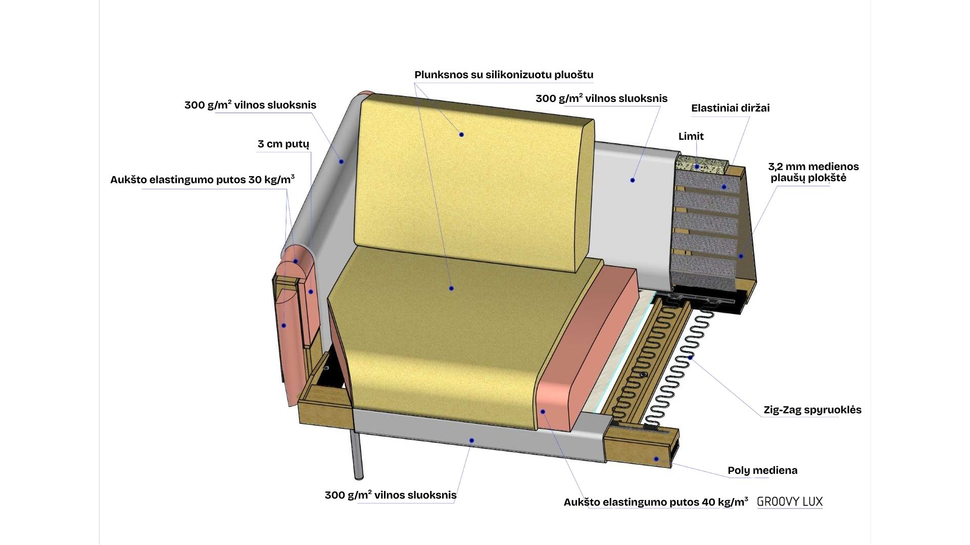 Rėmo gamyboje naudojama mediena ir „Zig-Zag” spyruoklės.