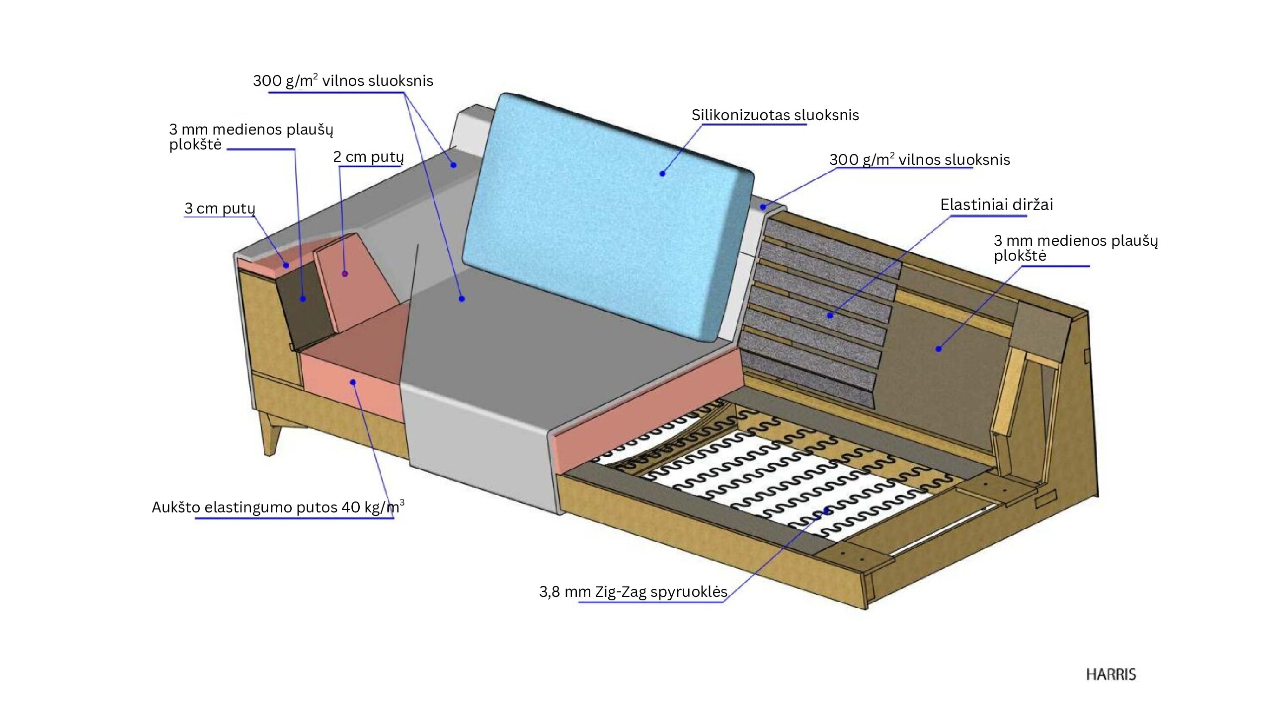 Rėmo gamyboje naudojama mediena , „Zig-Zag” spyruoklės ir elastiniai diržai.